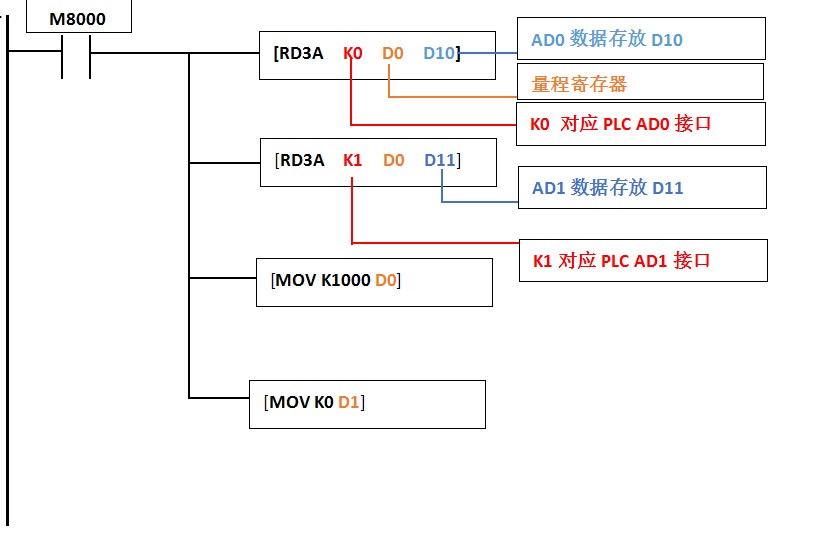 Когда приведенный выше пример программы: когда D10 data = 500, это означает, что вход аналогового сигнала 5 в считывается.