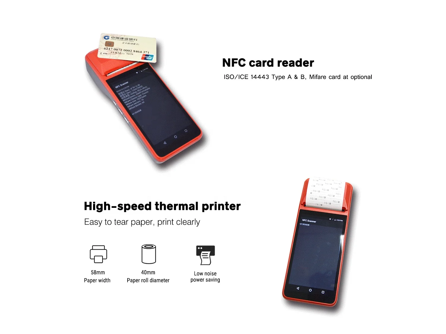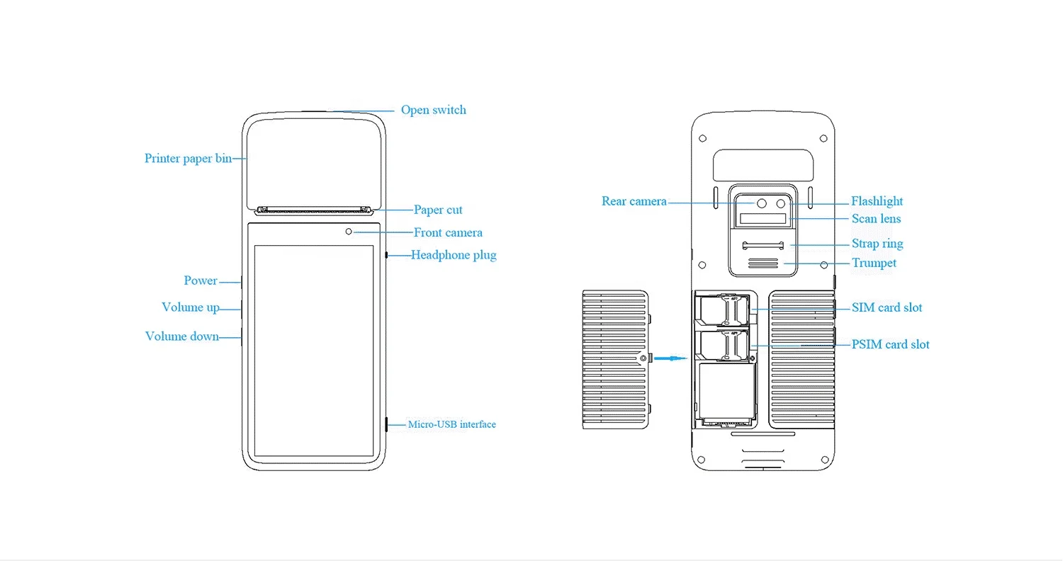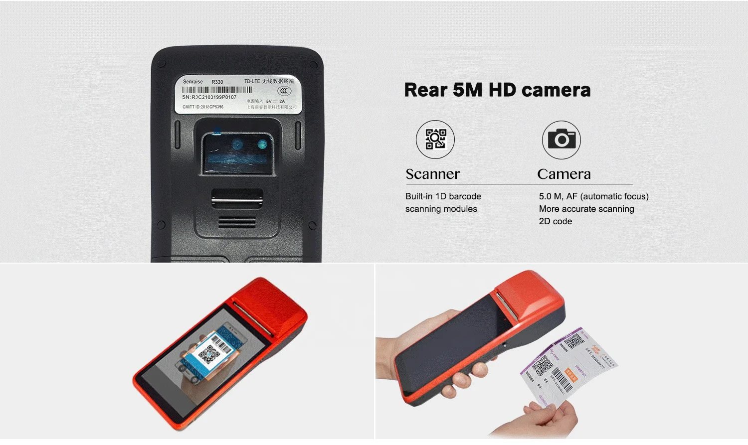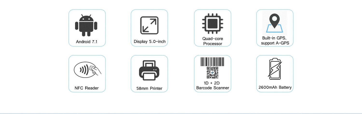 Android Smart POS терминал, с камерой 5 МП, GPS,4G + Wifi + Bluetooth, NFC, 1D модуль штрих-кода (для 1D штрих-кода)С 58 мм принтер, 5,0 дюймов ЖК-дисплей