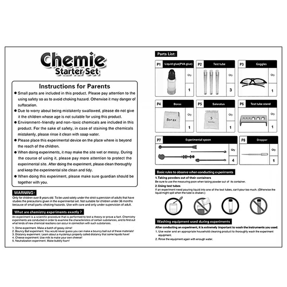 Посылка входят тюбики, мерный стакан, очки, жидкий клей, бикарбонат натрия и т. Д.