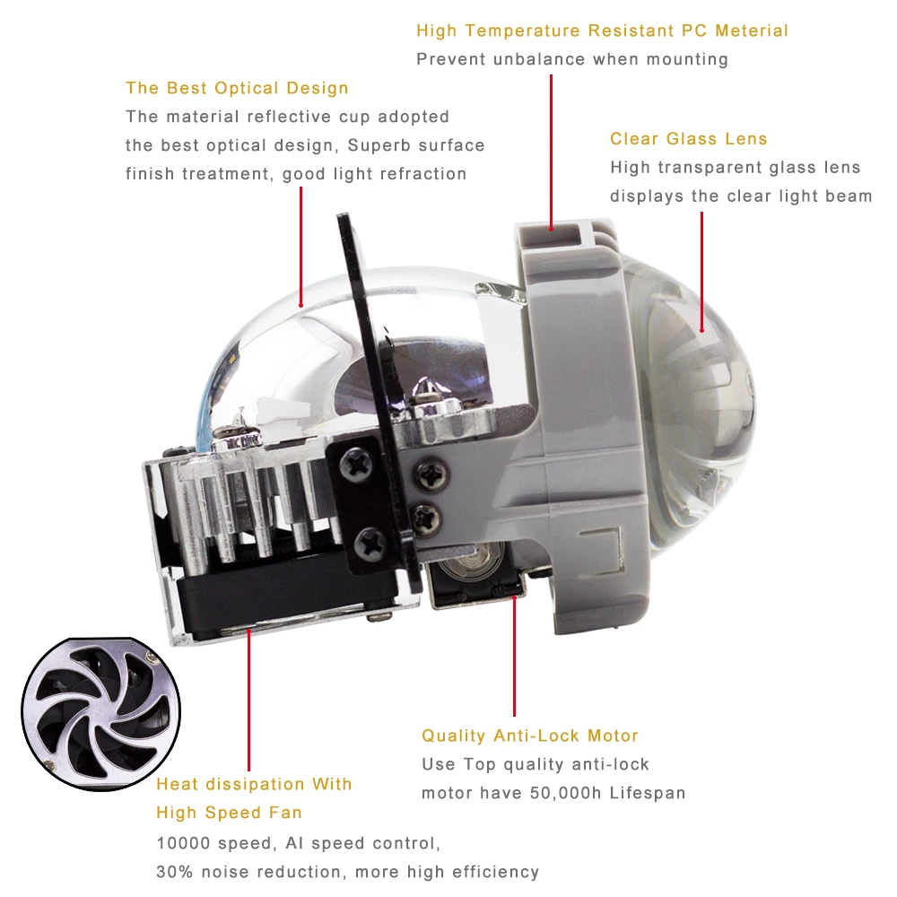 1, этот 2,5 дюймов светодиодный объектив проектора принимает высокую яркость импортных светодиодный чипы, обеспечивая более стабильную работу, нормативных светильник тени для век, более безопасное вождение, умнее, чем нормальный HID ксеноновая лампа.
