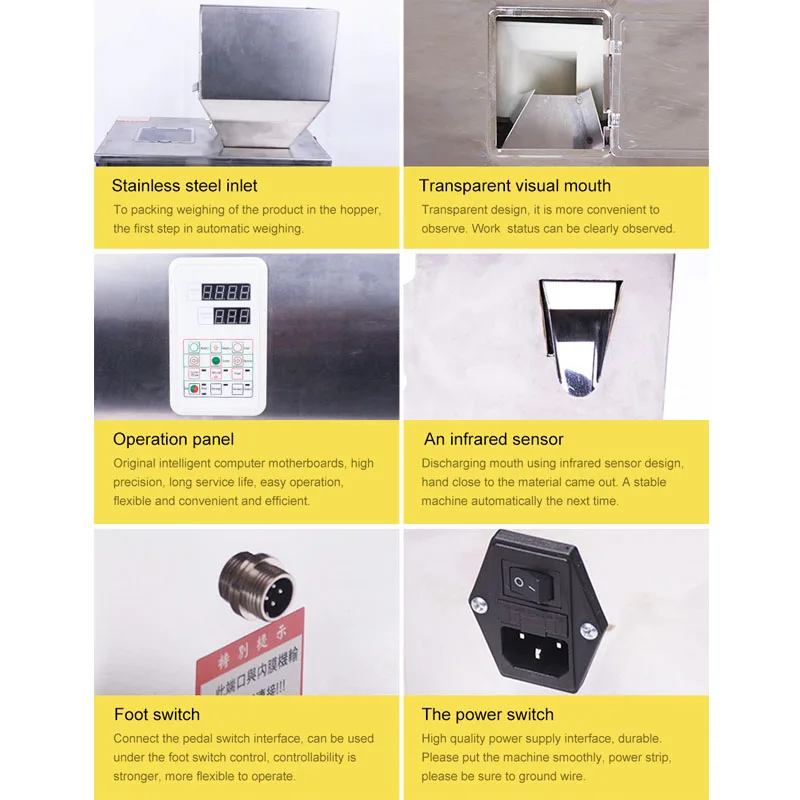 Рабочее напряжение: 220 В/110 В/50 Гц/60 Гц Номинальная мощность: 350 Вт Скорость упаковки: 6-15 пакетов/упаковка Диапазон взвешивания: 20-2500 г Неправильное значение: 2 г (в зависимости от продукта, который будет заполнен) [Объем] Этот продукт подходит для гранулированных, порошкообразных продуктов, риса, проса, злаков, семян овощей, удобрений, чая, волчи, корма для собак, рыбной пищи, сухофруктов, орехов, лекарственные соли, приправы, красные финики, грецкие орехи, каштаны, Сушеные longan, электронные оригиналы, аппаратные оригиналы, Пластиковые детали и т. Д.