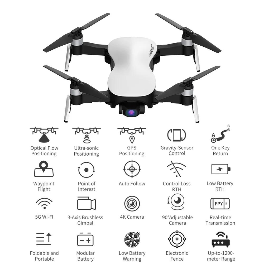 Функции: автоматическое следование, вперед/назад, отслеживание местоположения GPS, удержание высоты, автоматическое возвращение одной кнопкой, посадка одной кнопкой, взлет одной кнопкой, нажмите, чтобы летать, Повернуть влево/вправо, вверх/вниз