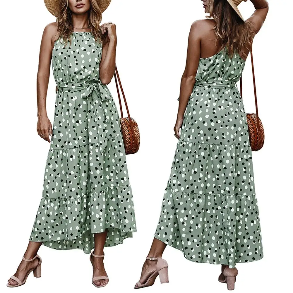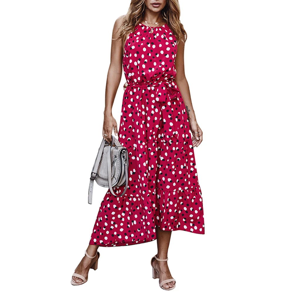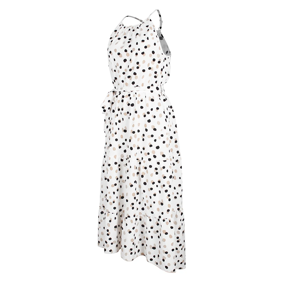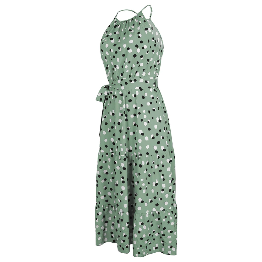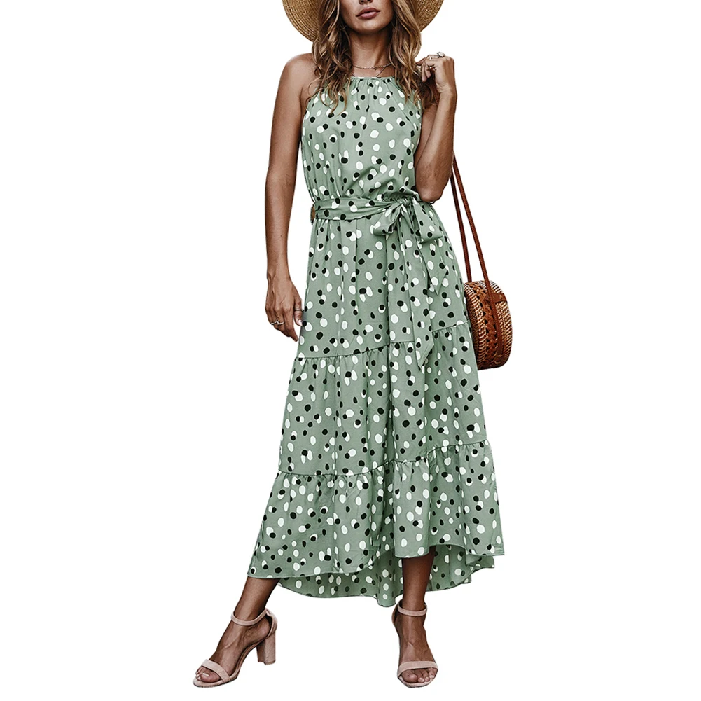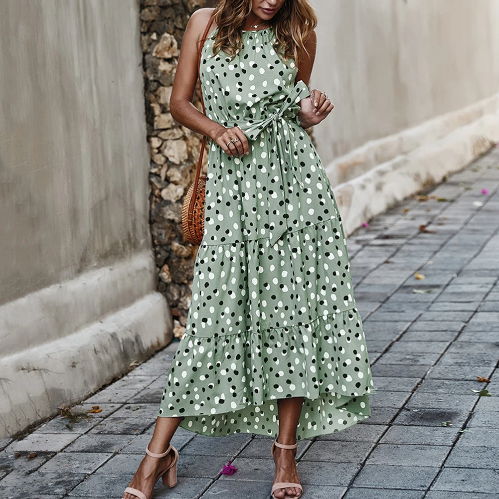 Летнее женское повседневное длинное пляжное платье в горошек без рукавов с поясом и большим подолом