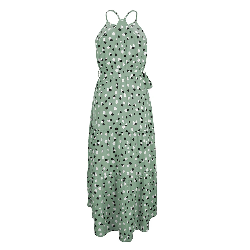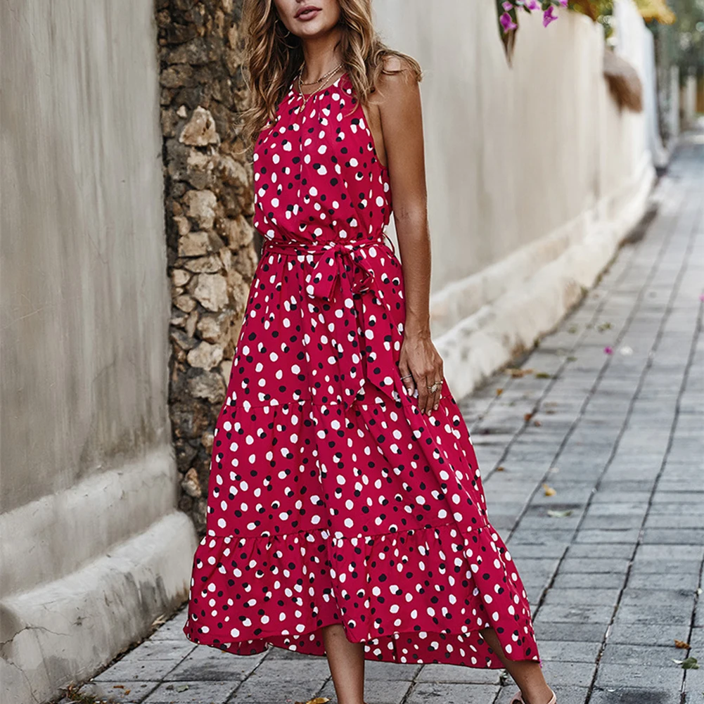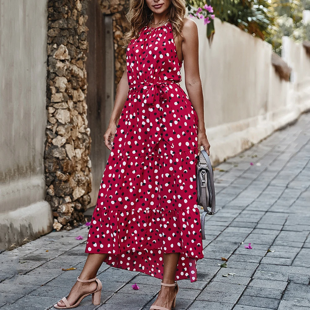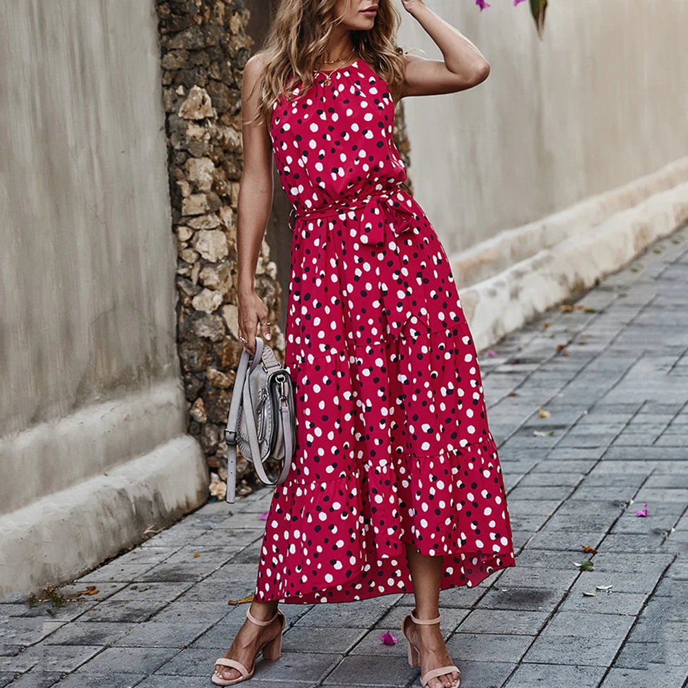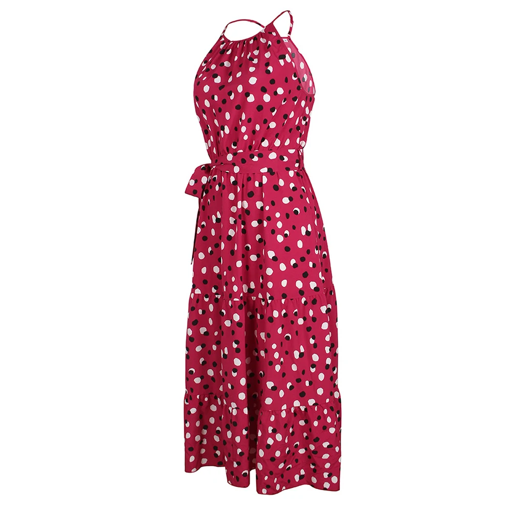 Летнее женское повседневное длинное пляжное платье в горошек без рукавов с поясом и большим подолом