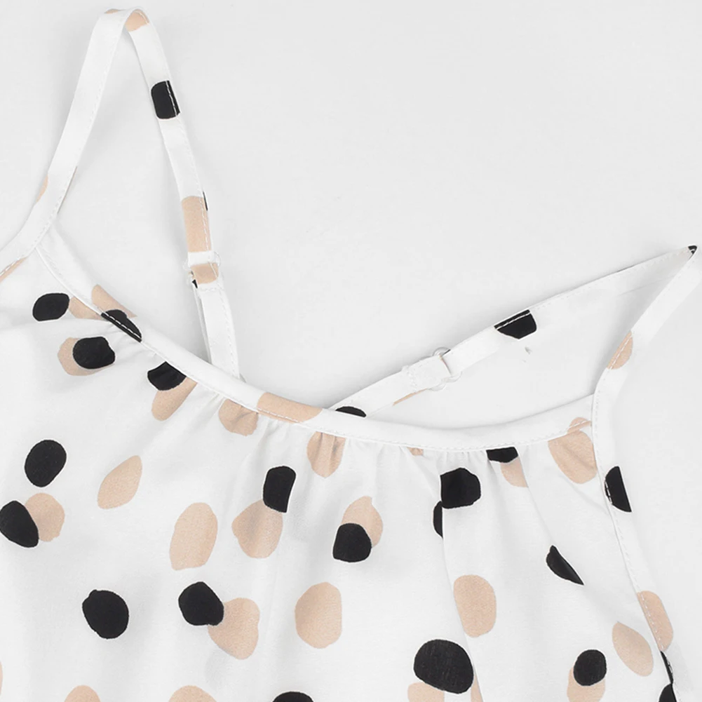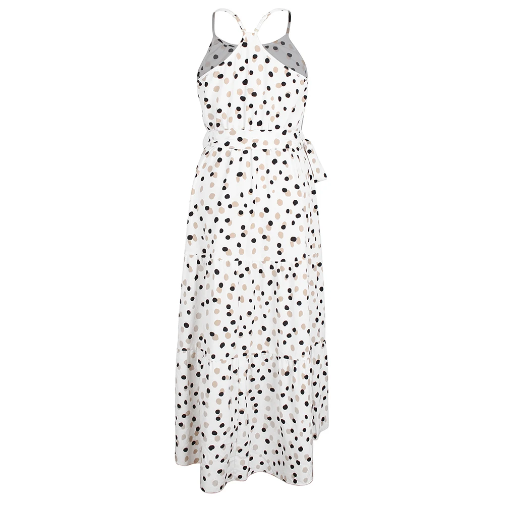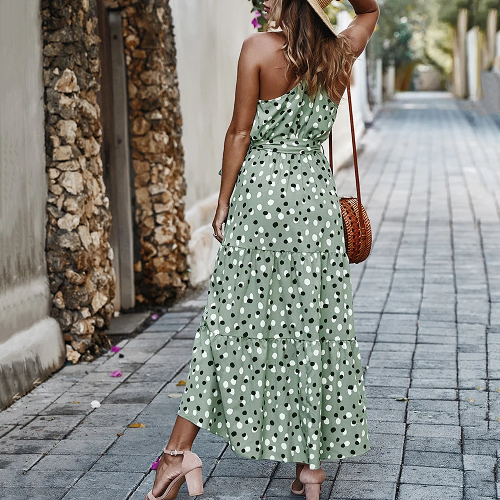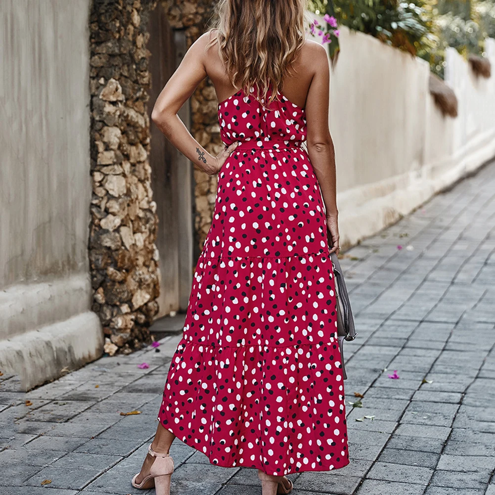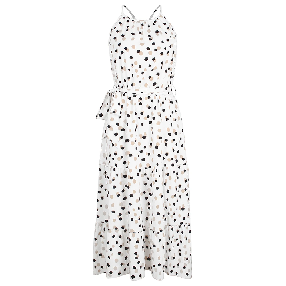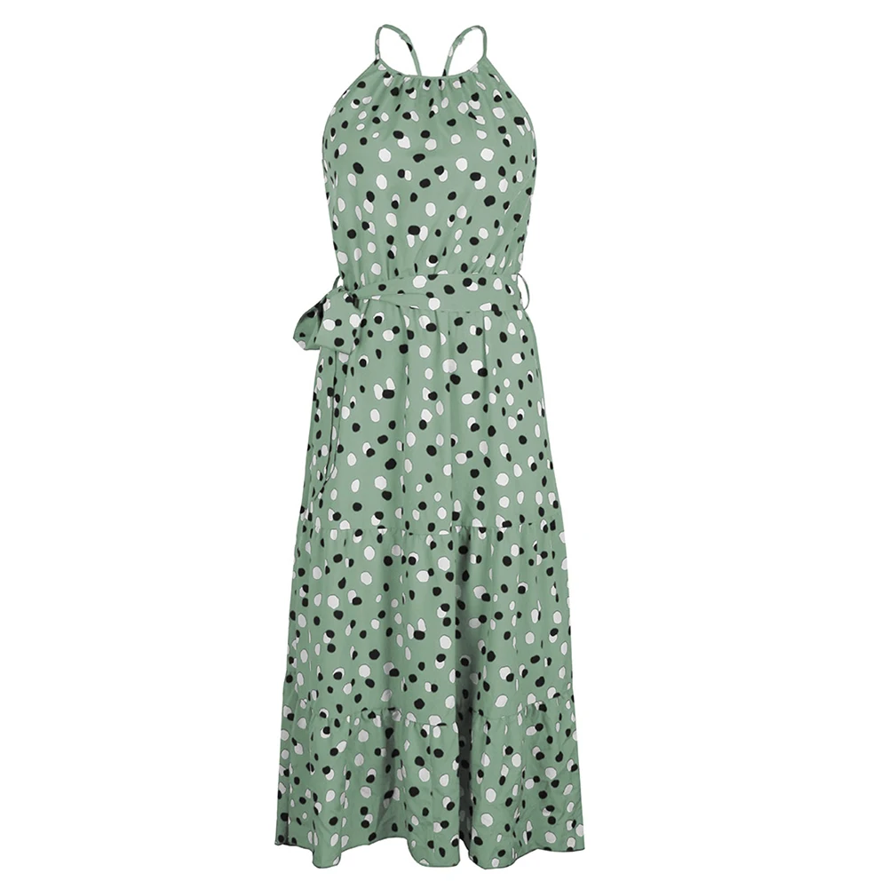 Летнее женское повседневное длинное пляжное платье в горошек без рукавов с поясом и большим подолом