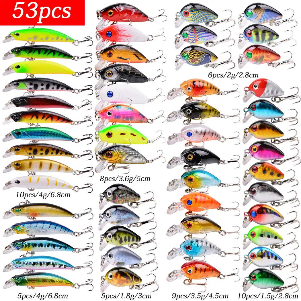 Длина/Вес: для ловли мелких рыб 4g/6,8 см; Crank 3,6g/ 5 см, 1,8g/ 3 см, 2g/2,8 см, 3,5 г/4,5 см, 1,5 г/2,8 см Материал изделия: АБС-пластик Глаза (глаза):3D глаза Упаковка: 53 шт OPP мешокПримечание: