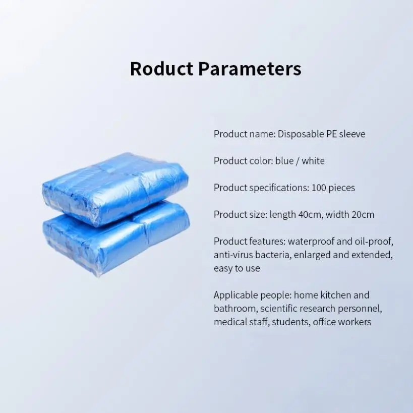 Product name: Disposable protective sleeve Product function: Waterproof, oilproof, dustproof Product material: PE Product color: blue , white Packing quantity: 100 Pcs Product size: 40 * 20cm Applicable people: home kitchen and bathroom Product features: waterproof and oil-proof, increased length, easy to use packing list: 100 * disposable protective sleeve