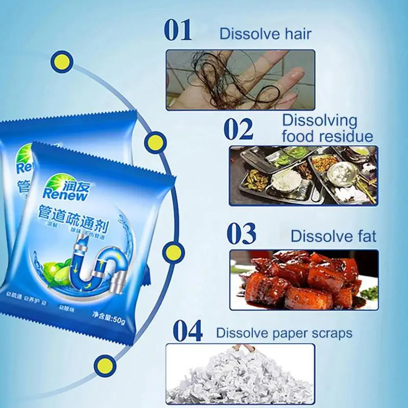 Сильный драга-о-ионы корня, содержащиеся в сливе, могут быстро и эффективно растворить масло, волосы, остатки чая, мыло и другие органические вещества в сливной трубе; безопасный и надежный-испытанный управлением, этот продукт не повредит или не повредит стенку трубы, безопасный и надежный;