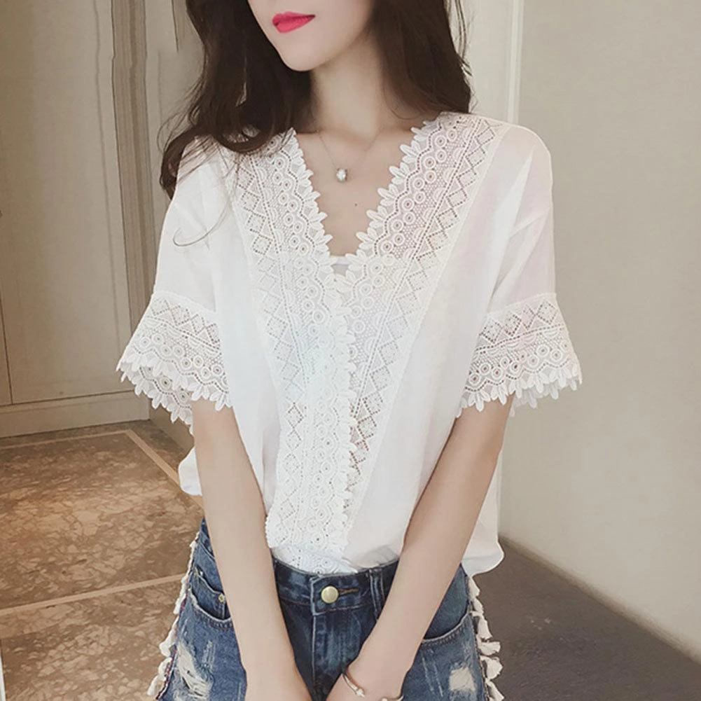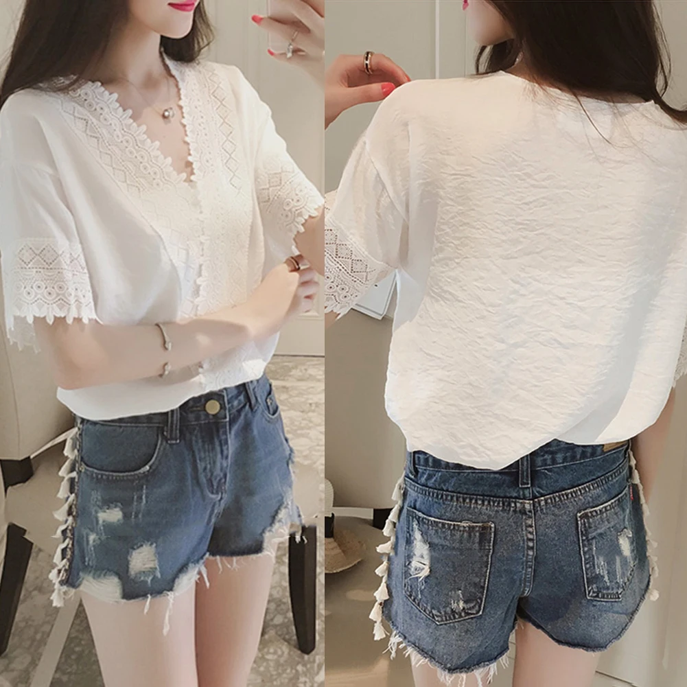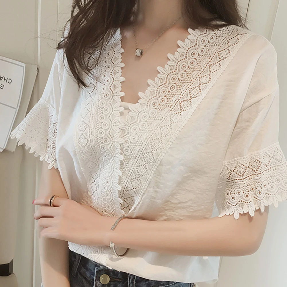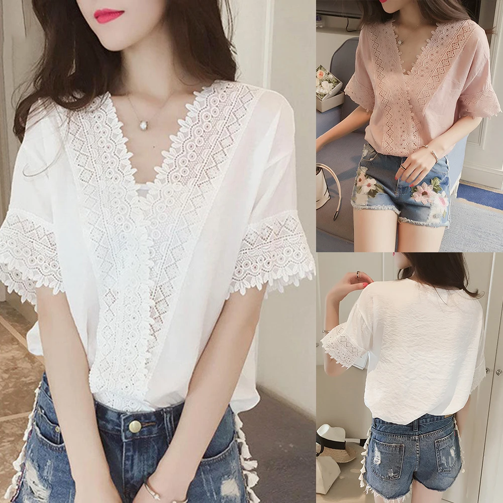 Повседневная Женская однотонная шифоновая блузка с v-образным вырезом и коротким рукавом