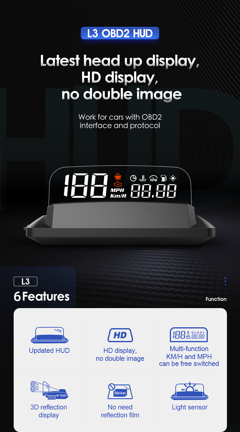1: HUD предназначен для бензиновых автомобилей в международных стандартных автомобилях OBD2, дизельные автомобили не могут быть совместимы, потому что дизельный автомобиль имеет различные автомобильные компьютеры с бензиновыми автомобилями. Если ваш автомобиль является дизельным, электронным или гибридным автомобилем, вы можете связаться с нами для покупки версии GPS.