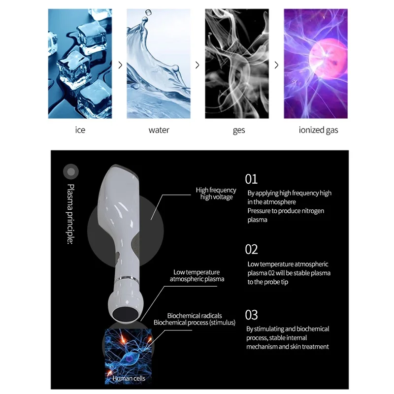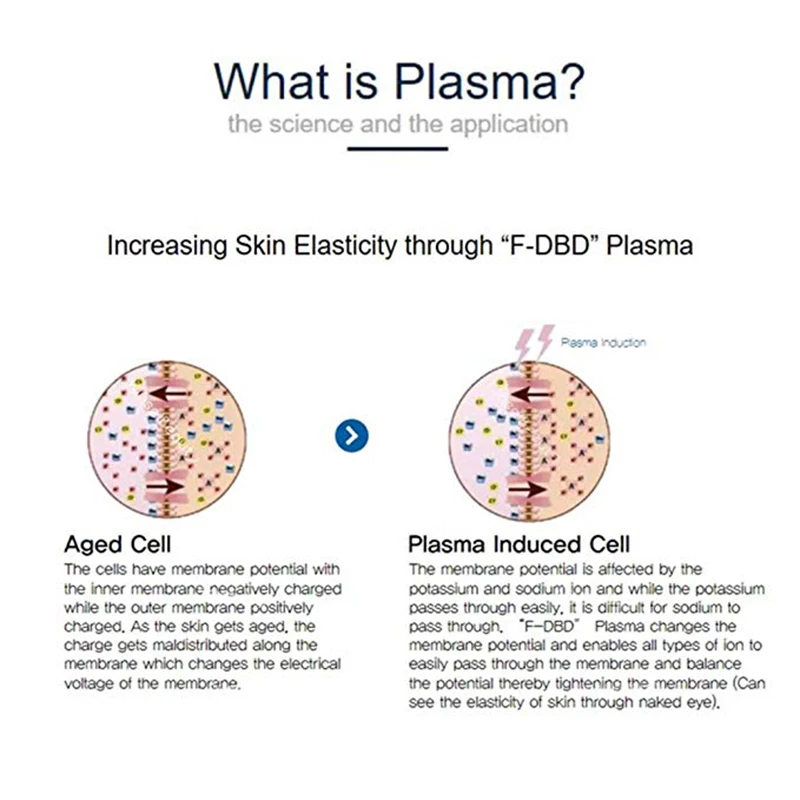 Создание плазмы путем применения высокочастотного, высокого давления в атмосферу, поставляя стабильный Ион плазмы к кончику наконечника, стабильный и эффективный механизм лечения кожи путем стимуляции биохимического процесса во внутренней и внешней областях биологических клеток.