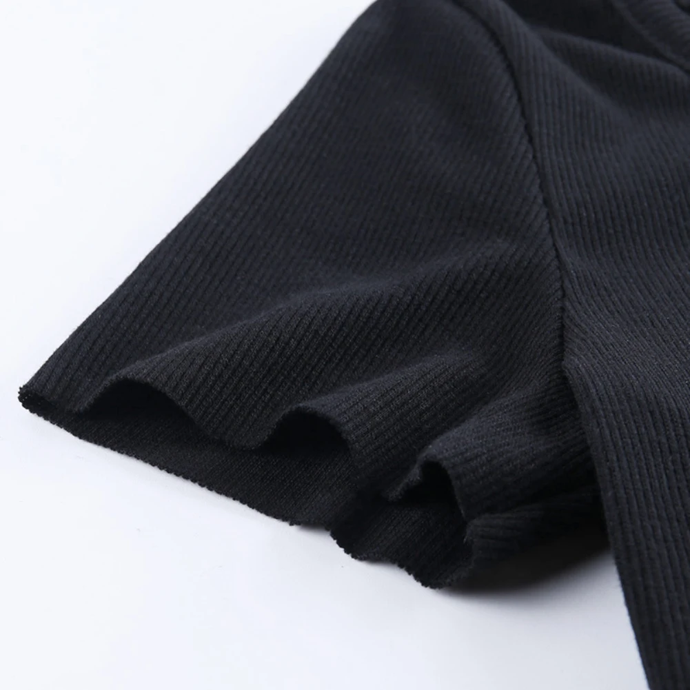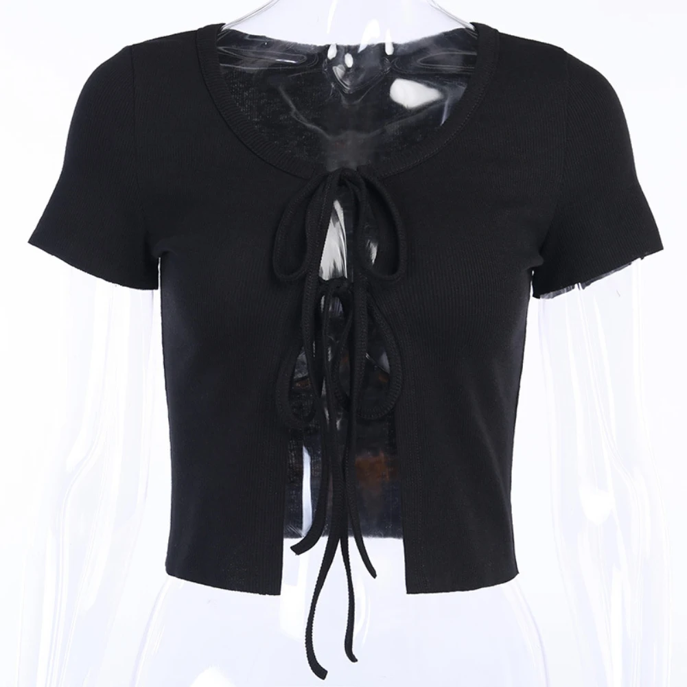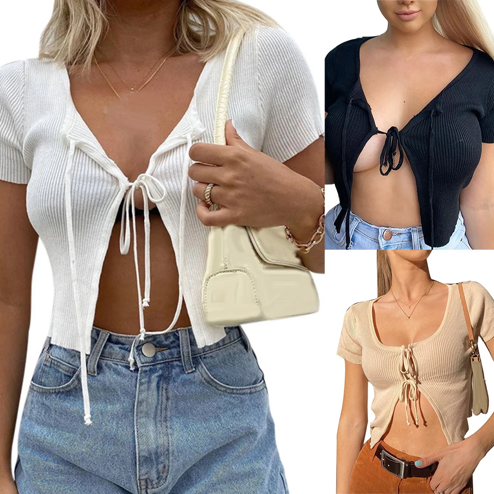Женский сексуальный укороченный топ, футболка с коротким рукавом, ребристая открытая передняя грудь, бандажная блузка