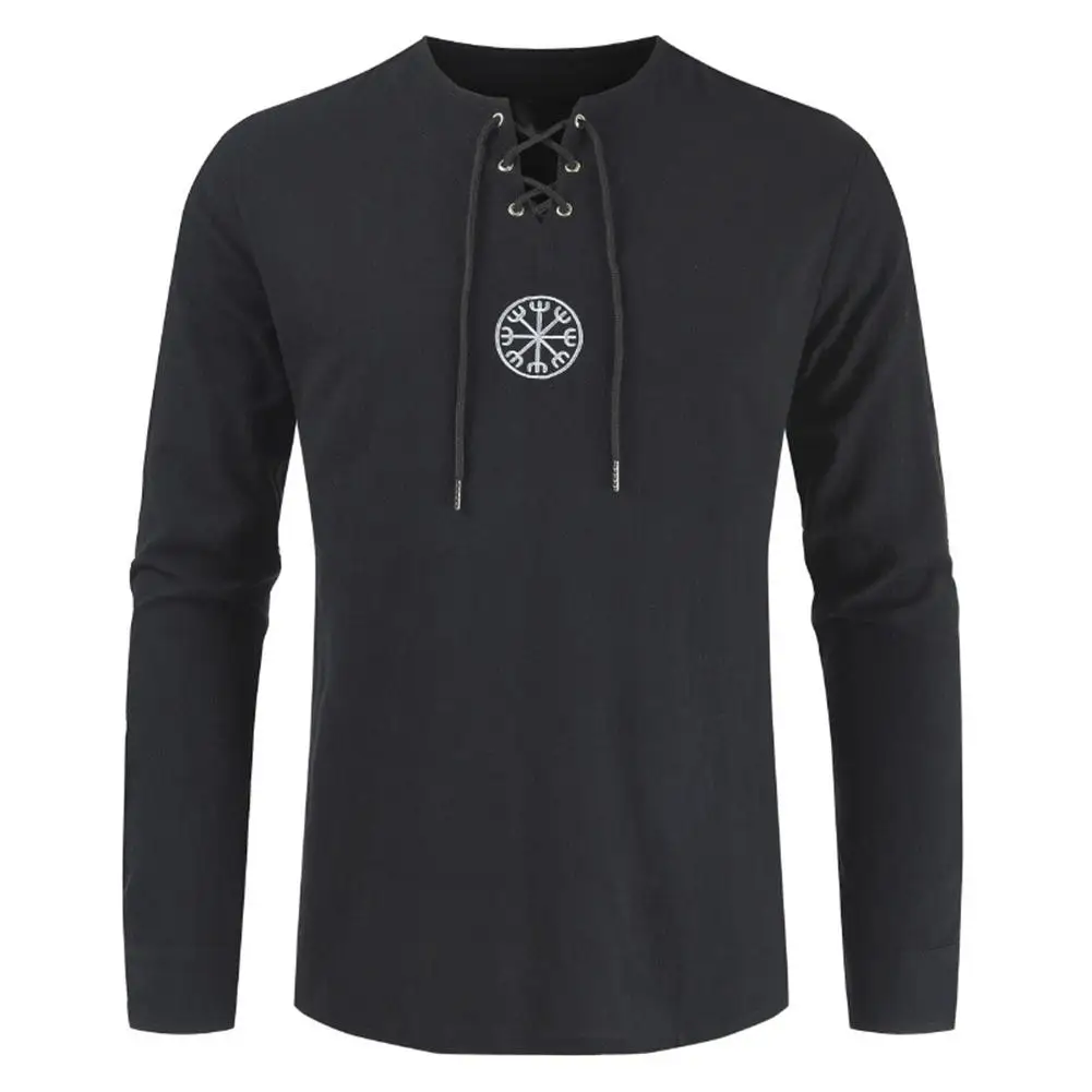 Мужская рубашка размера плюс, топ с вышивкой древнего Викинга, на шнуровке, с v-образным вырезом, с длинным рукавом, топ для мужской одежды