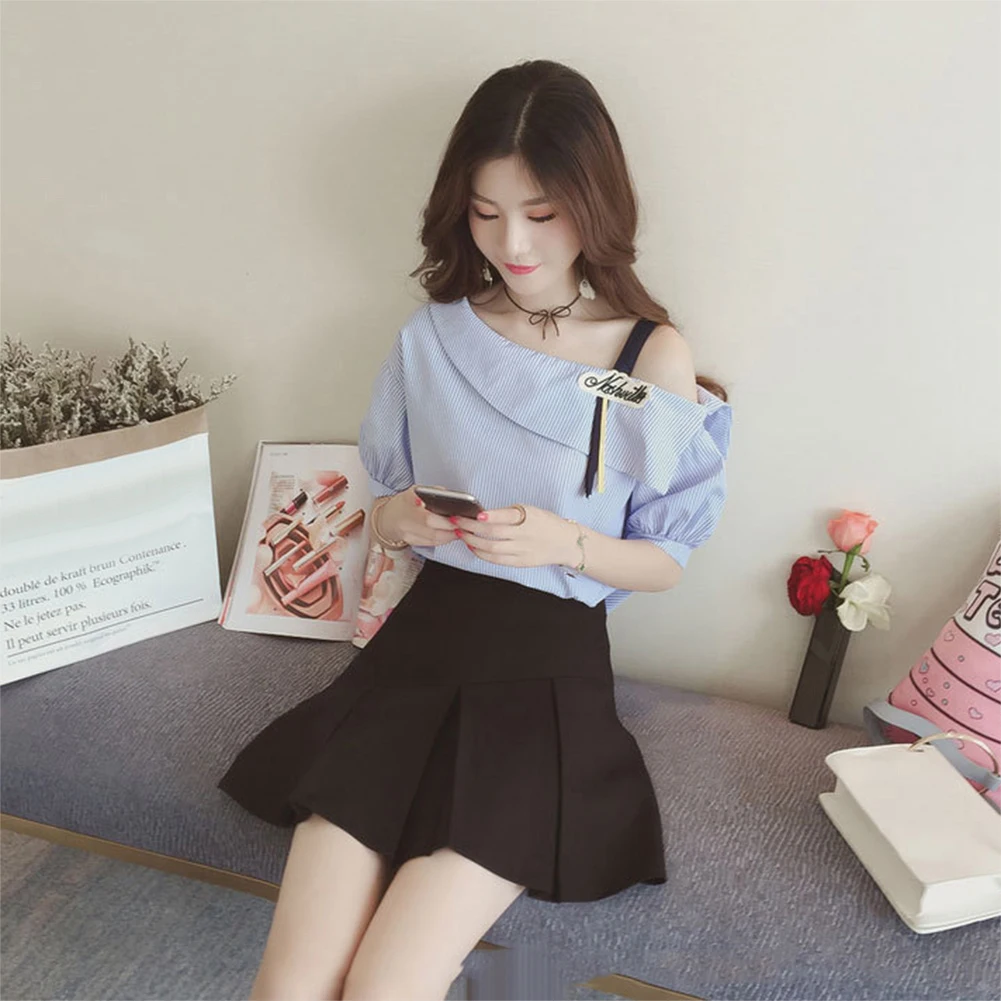 Рукав до локтя, одно плечо и узор в полоску делают его стильным и повседневным.