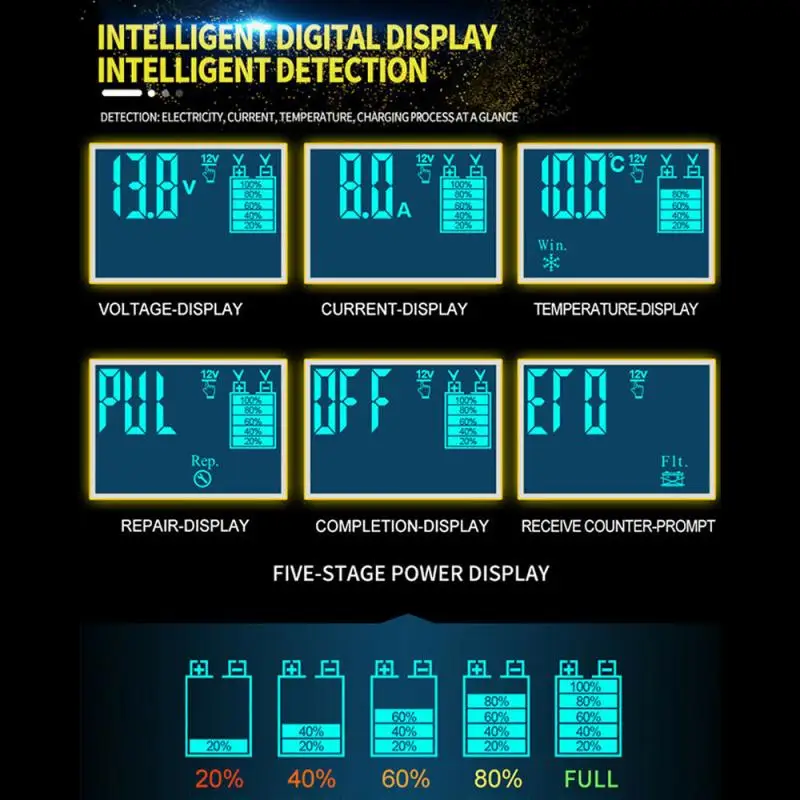 4. ЖК-экран отображает состояние зарядки и состояние батареи; Автоматическое обнаружение температуры окружающей среды, и зарядное устройство может автоматически регулировать напряжение зарядки в соответствии с температурой окружающей среды