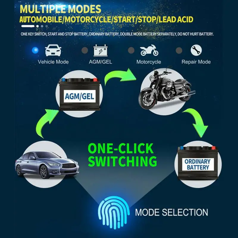 2. Он имеет 3 режима, дизайн сенсорной кнопки. При касании появляется звук нажатия, и режим автомобиля, режим мотоцикла, AGM режим, выбор режима ремонта зарядка может быть переключена в любое время, решая проблему нажатия кнопки