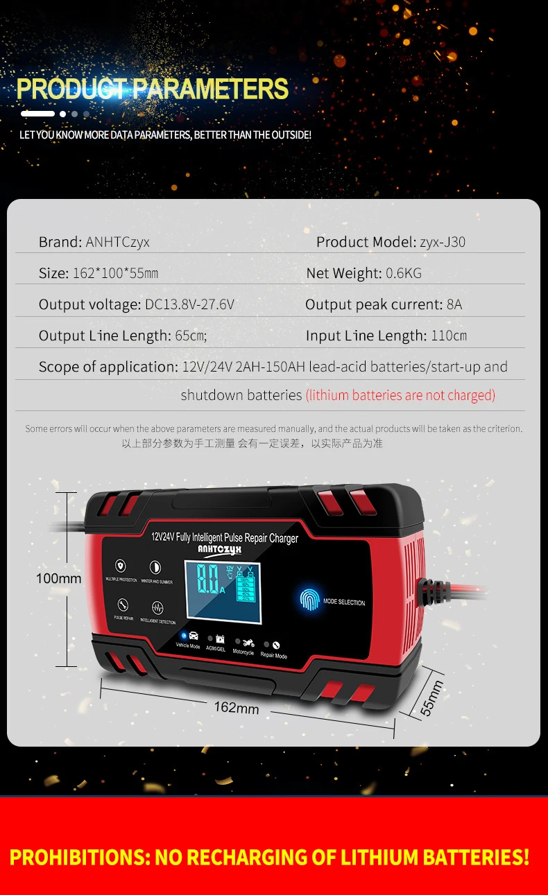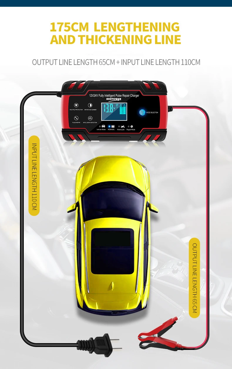3. Это зарядное устройство предназначено для батарей 12 В и 24 В, либо оно может заряжать аккумулятор грузовика или другие автомобильные аккумуляторы, такие как автомобиль, гольф-кары, мотоцикл, газонокосилка, лодка, RV, внедорожник, ATV и многое другое. Примечание: литиевая батарея отключена