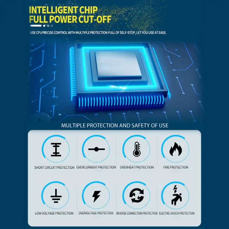 1. Принять огнестойкий корпус ABS, огнестойкий, электрошок, устойчивый к коррозии, прочный и прочный, Встроенный предохранитель для защиты цепи от обратной полярности, искры, перезарядки, перегрузки по току, открытого замыкания, короткого замыкания и перегрева. Примечание: Не заряжайте литиевый аккумулятор