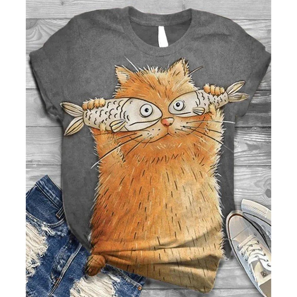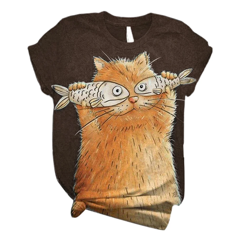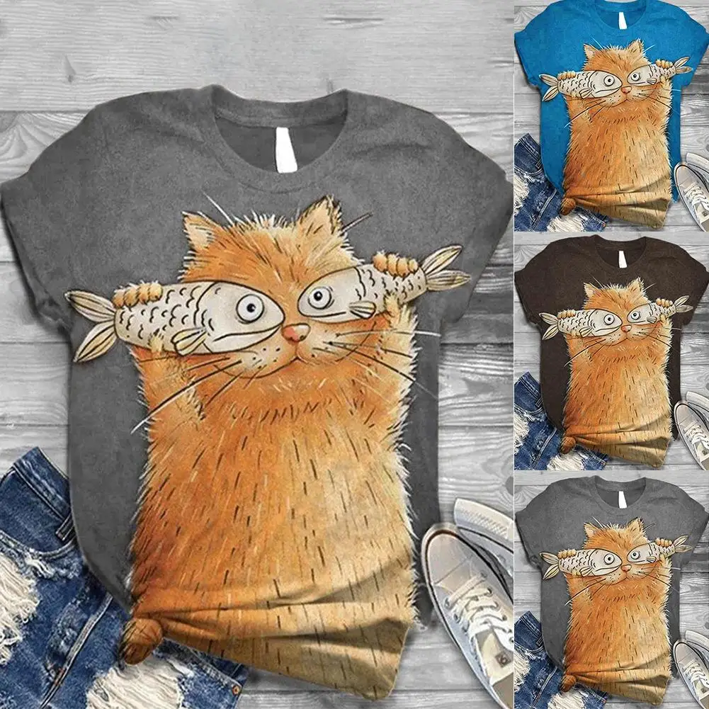 Женская Повседневная летняя Свободная блузка с круглым вырезом и коротким рукавом с принтом кошки и рыбы, футболка, Топ