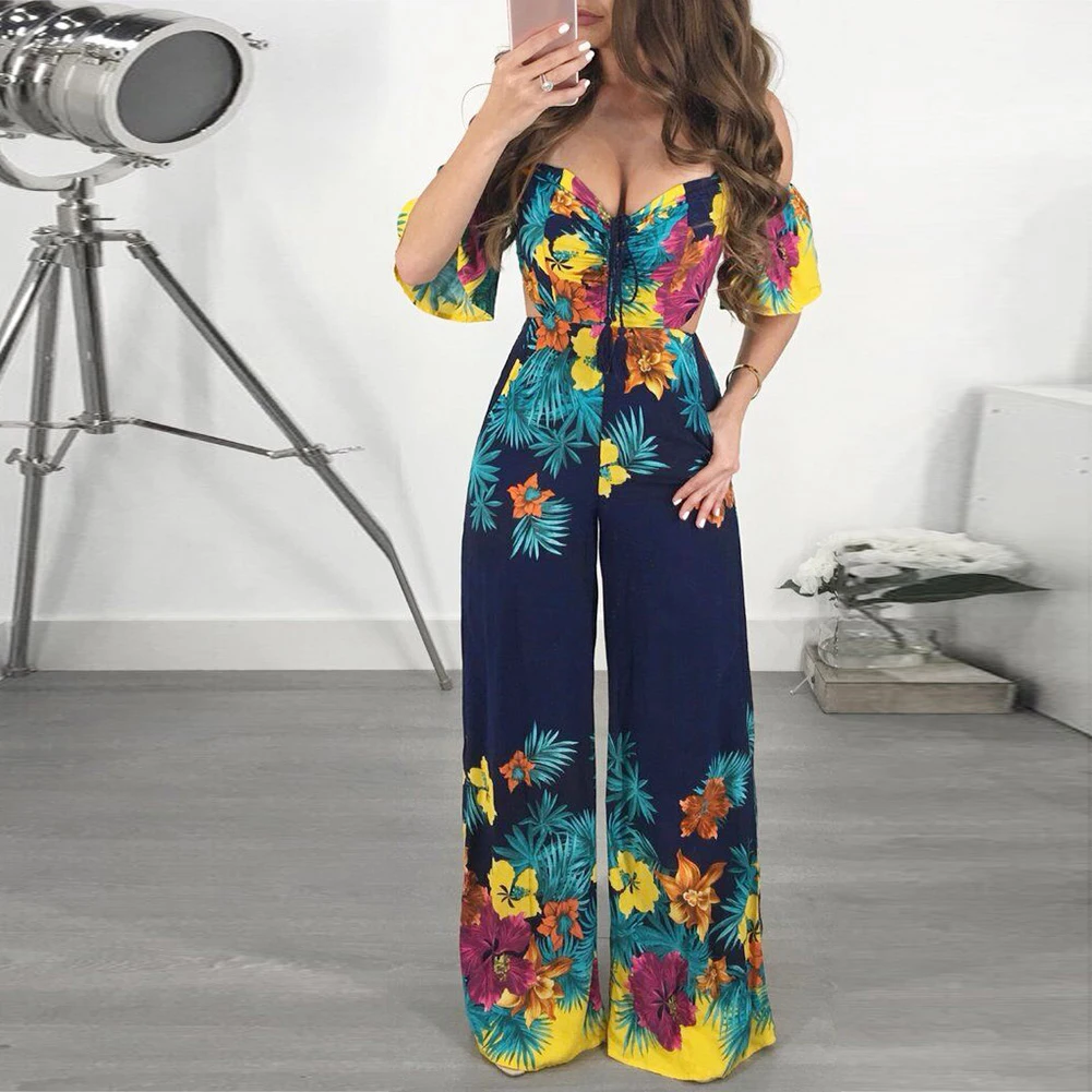 Женский сексуальный комбинезон с цветочным принтом на бретелях, комбинезон с широкими штанинами