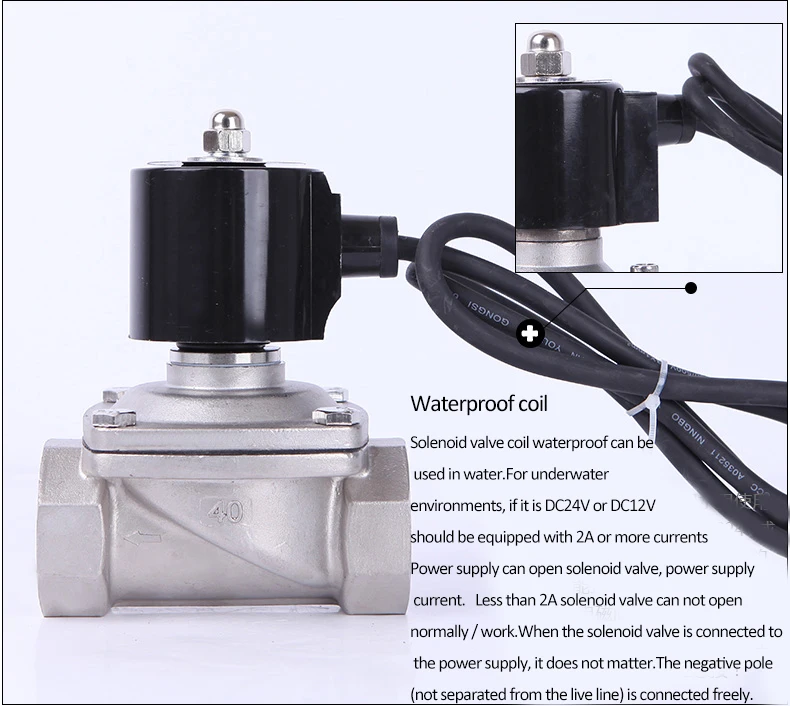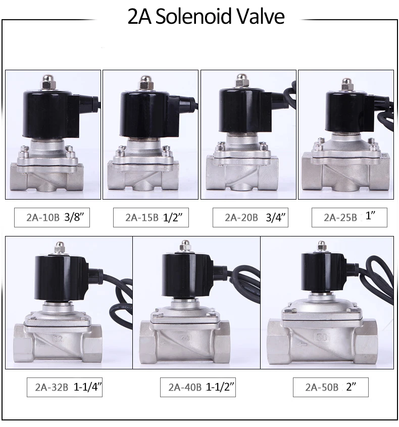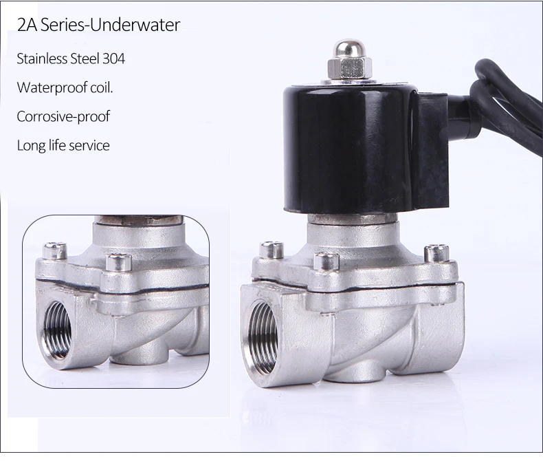 Номер модели : 2а серия Нить: Женская (BSP, G резьба, NPT резьба) Средняя: вода, газ, нефть Тип: нормально закрытый Рабочее напряжение: 220VAC, 110VAC, 24VDC, 24VAC, 12VDC. Рабочее давление: 0-10 бар Операция: прямое действие Водонепроницаемый IP: IP68 Материал корпуса: нержавеющая сталь Уплотнение: NBR Средняя температура: -5-80 градусов