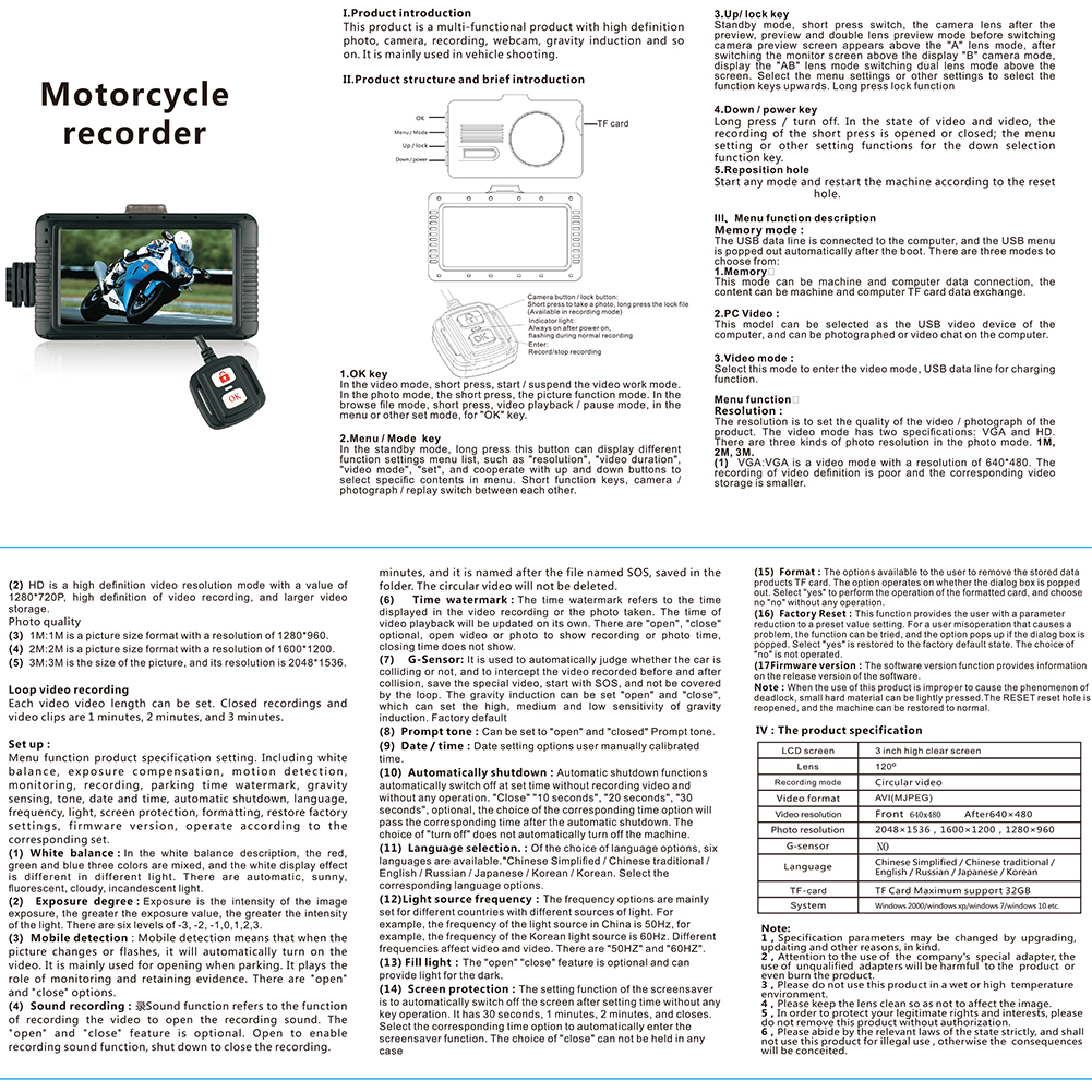 Характеристики: -Модель: SE100 -Чипсет: Jieli 5201 -Передняя линза: 7740 -Задний объектив: V06 -Экран дисплея: 3,0 "цветной 16:9 HD экран -Доступные пиксели: 1920*1080 передние линзы -Формат видео: VGA -Сжатие видео: MJPG -Частота кадров: 1080P, 60f/s -Формат фото: JPEG, до 12 м 4032*3024 -Датчик столкновения: трехосевое стерео Обнаружение столкновений -Режим записи: формат VGA, циклическая запись -Прерывание видео: 0 мс -Хранение: Поддержка карт TF 4 ГБ ~ 32 Гб (не наклоняется) -AP encryption player: native system formats и автоматически генерирует AP player -Время запуска: 2s -Рабочее напряжение: 5 В постоянного тока -Рабочий ток: 650 мА -Статический ток: < 100uA -Температура хранения: -20 ℃ ~ 70 ℃ -Рабочая температура: 0 ℃ ~ 60 ℃ -Рабочая Влажность: 15%-60% относительной влажности -Тип батареи: 180 мАч высокотемпературный литий-полимерный аккумулятор -Материал корпуса: цинковый сплав -Размер посылка: 190*110*72 мм/7,48*4,33*2,83" -Вес: 0,4 кг Посылка включает в себя: 1 * хост 2 * камеры 1 * кабель 1 * кронштейн 1 * переключатель 1 * Руководство пользователя Меры предосторожности: 1. Все фотографии были профессионально откалиброваны, но из-за окружающего светильник и различных настроек дисплея, изображения и предметы, которые вы видите, могут иметь некоторые отклонения, пожалуйста, простите меня. 2. Данные измеряются вручную, могут быть некоторые отклонения, но это не влияет на использование.