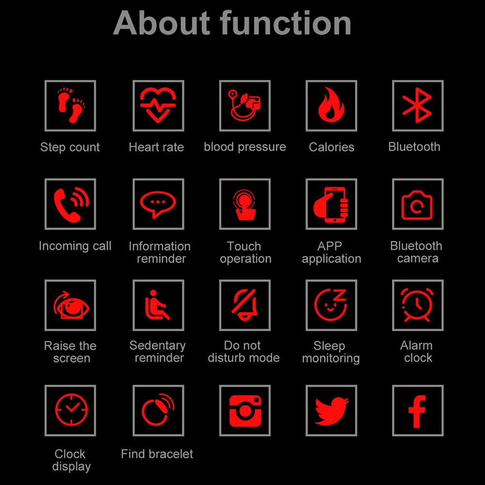 Функции: мониторинг сердечного ритма, подсчет шагов, калорий, расстояния, RTC дисплей, автоматический мониторинг сна, напоминание о звонках, информационный сигнал, напоминание о тревоге, анти-потеря, удаленная камера и т. Д.