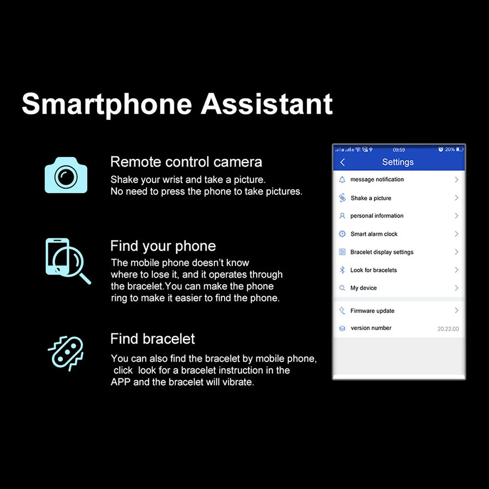 Съемка, напоминание о сидячем положении, монитор сна, информационный push(SMS, WeChat, QQ, Facebook, Twitter, WhatsApp,