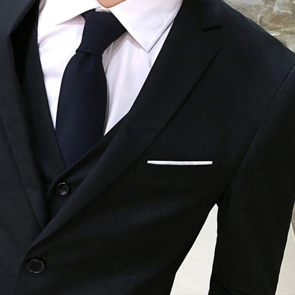 Этот костюм включает жилет, блейзер и длинные штаны.