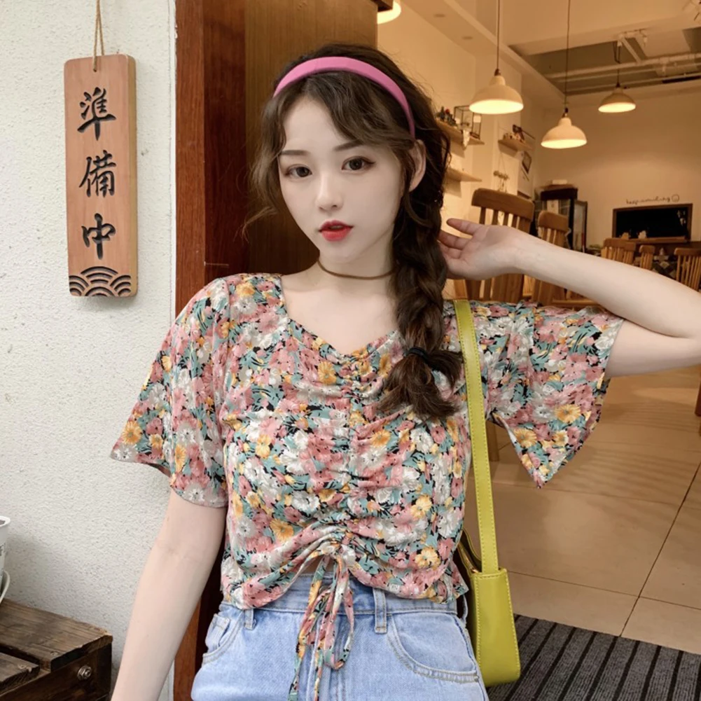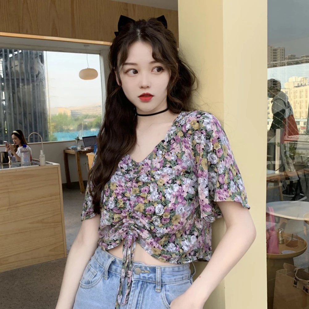 Женская шифоновая винтажная Цветочная футболка с v-образным вырезом и коротким рукавом