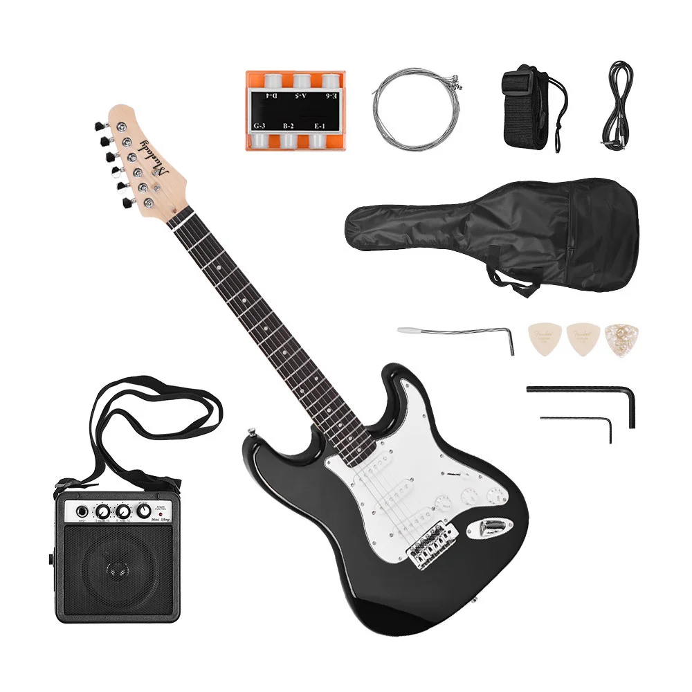 Come with a 6.35mm cable, small crank, speaker, guitar bag and strap, picks, pitch pipe and an extra strings.