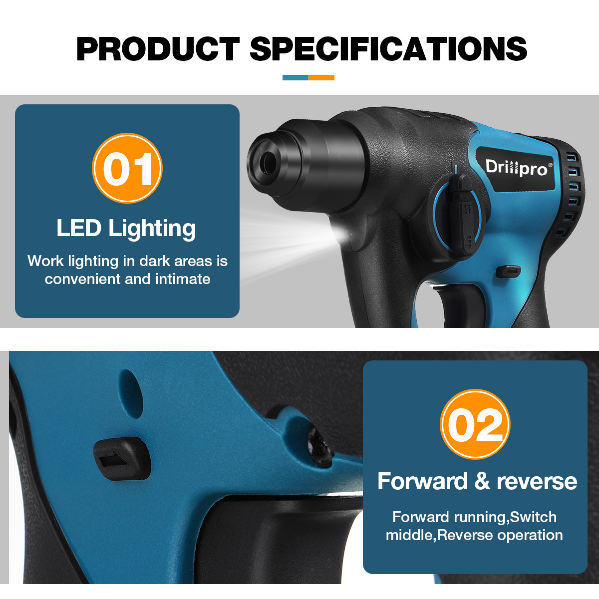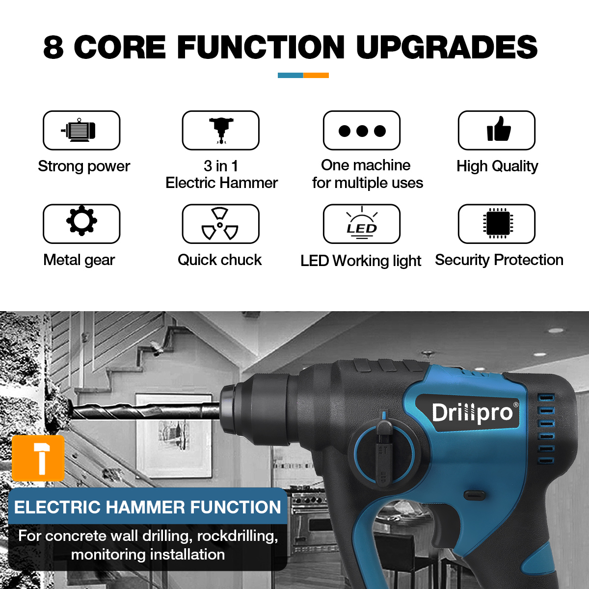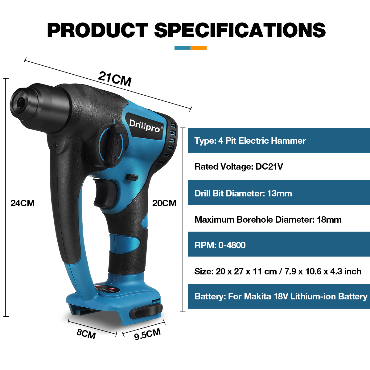 Функции: беспроводной, электрический молоток, электрическая дрель