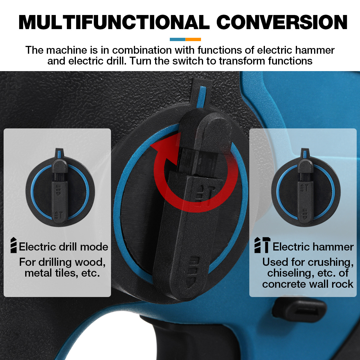-Машина в сочетании с функциями электрического молотка и электрической дрели. Поверните переключатель для преобразования функций.