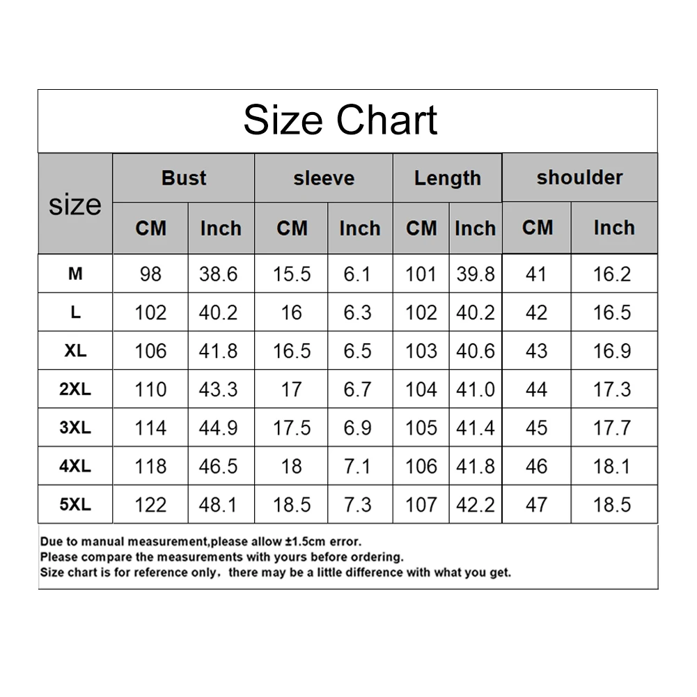 [Наш Размер 5XL] Обхват груди: 122 см/48 дюймов, Плечи: 47 см/18,5 дюйма, рукав: 18,5 см/7,3 дюйма, длина: 107 см/42,1 дюйма (прибл.)