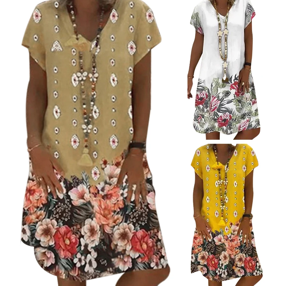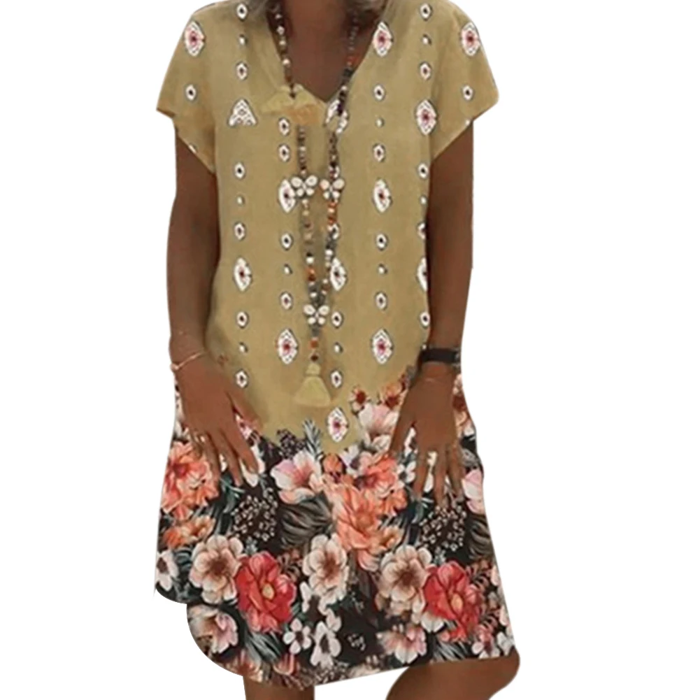 Женское винтажное летнее свободное платье до колена с коротким рукавом и V-образным вырезом, цветочным принтом