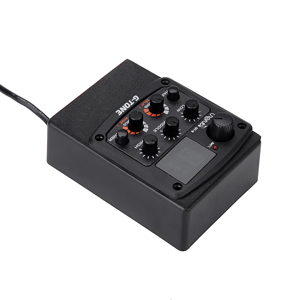 GT-6 is a 3 Band EQ with built-in highly accurate chromatic tuner. It has phase, reverb, delay, chrous and wide effects. The compact size makes it easy to install into a guitar and the visible portion is only 52mm * 54mm * 4mm. Low battery message is displayed when the battery is getting low.