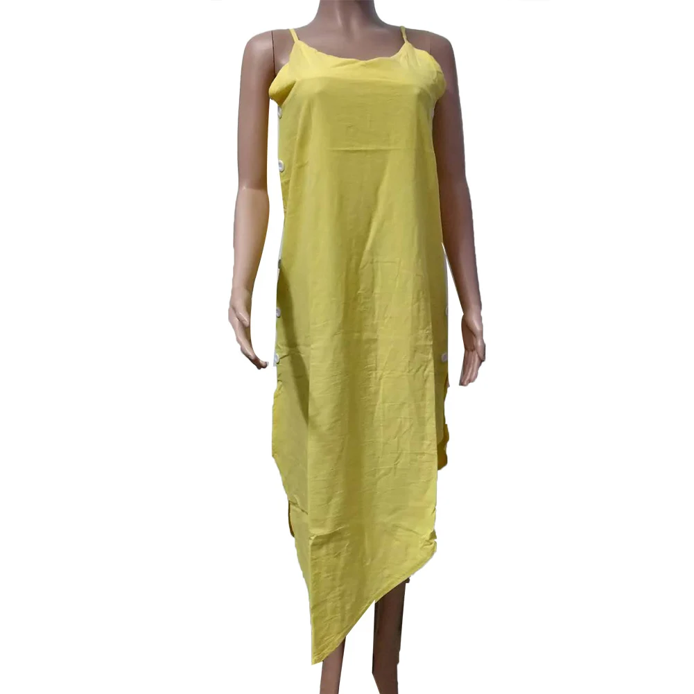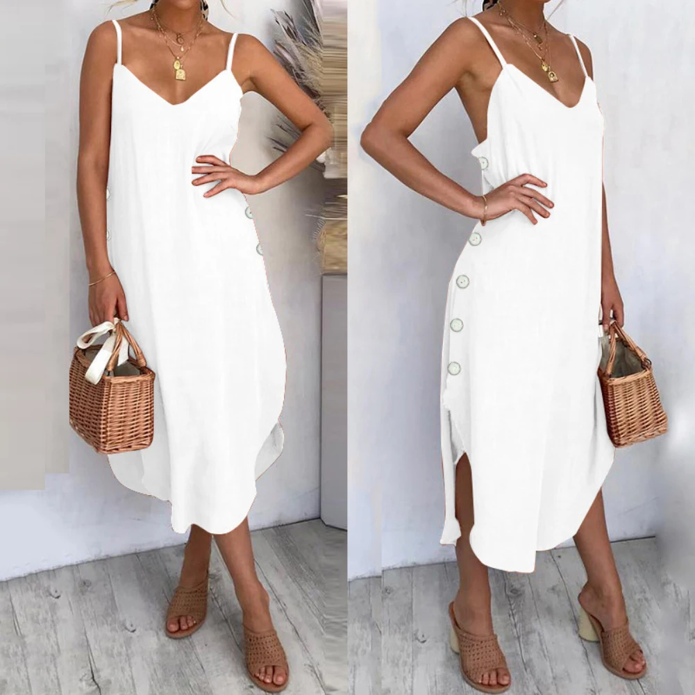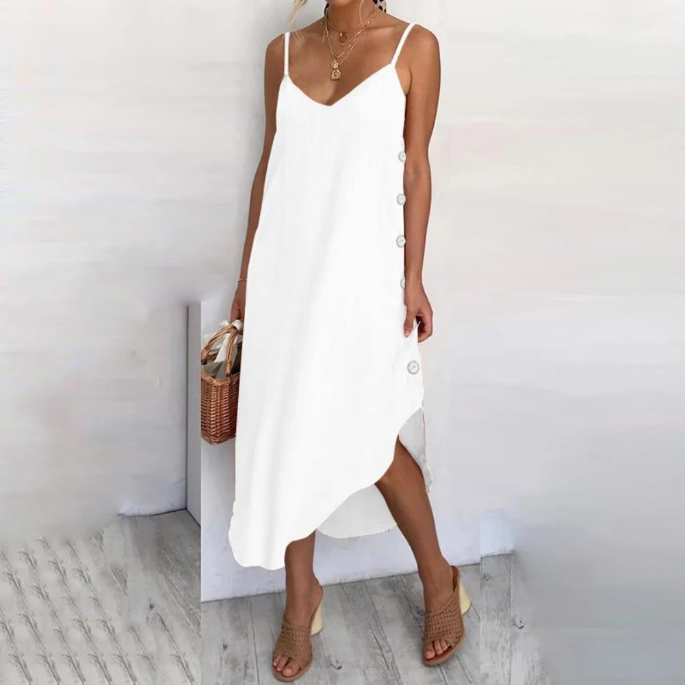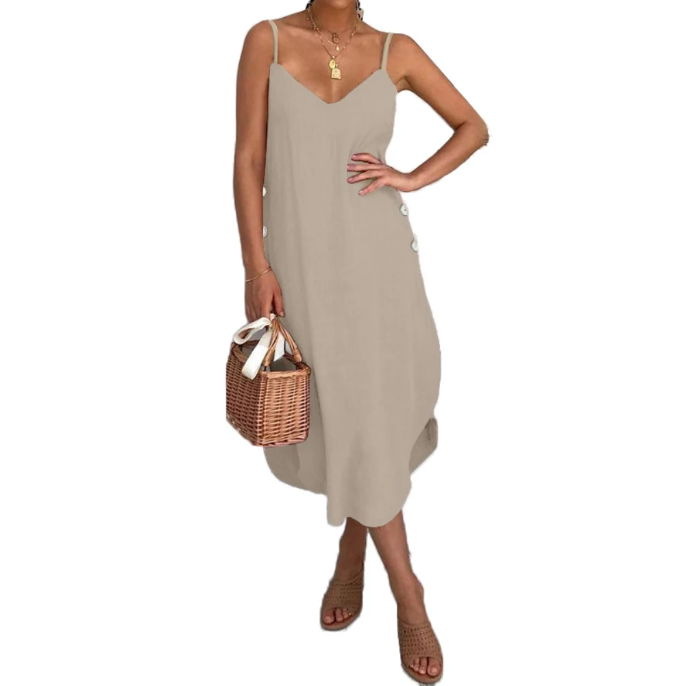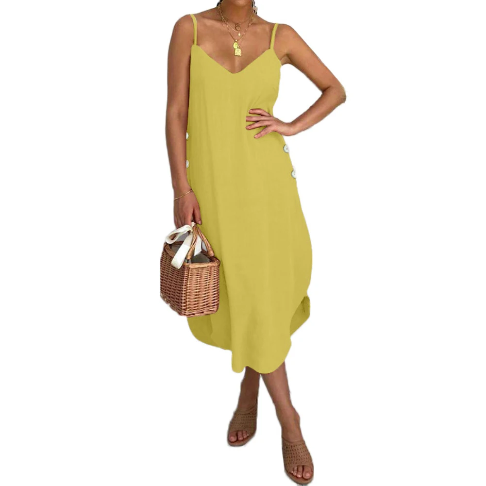 Новинка 2020, женское S-4XL, сексуальное Повседневное платье на бретельках, с пуговицами, разрезом, асимметричным подолом, миди, платья на бретельках, женское летнее пляжное платье для вечеринки